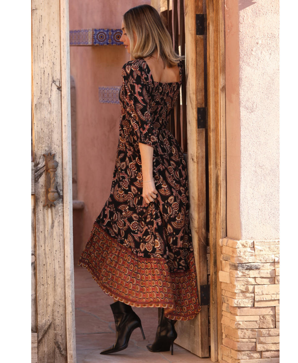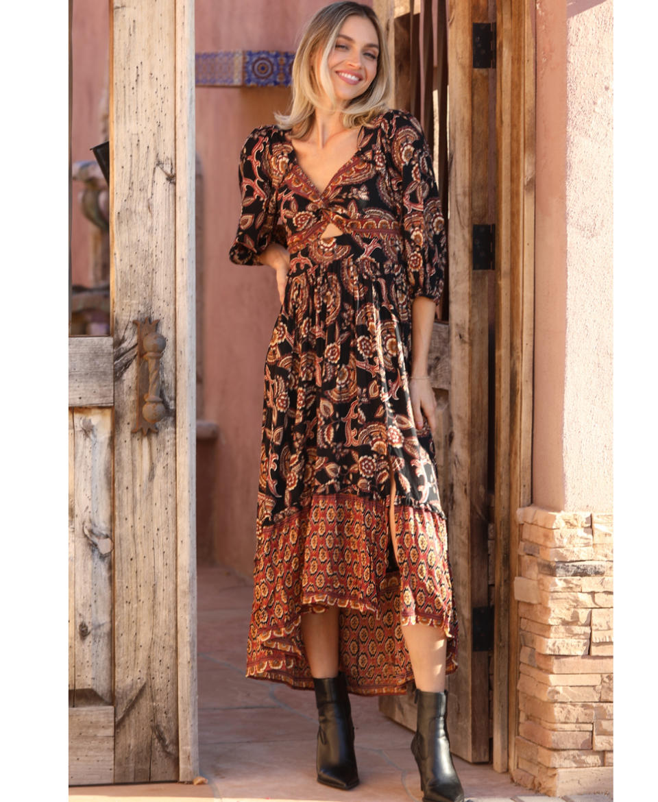 The V Neck Twist Front Half Sleeve Maxi Dress with Slit is a perfect choice for day parties or everyday wear. This black maxi dress, adorned with a paisley pattern, offers a flattering fit & flare silhouette. The dress features a v-neckline, a twist front, and 3/4 sleeves. Designed for the junior size range, it is part of a collection that embodies a well-traveled, romantic spirit. Bold, poetic, yet instantly wearable, it reflects a fondness for color and embellishment.